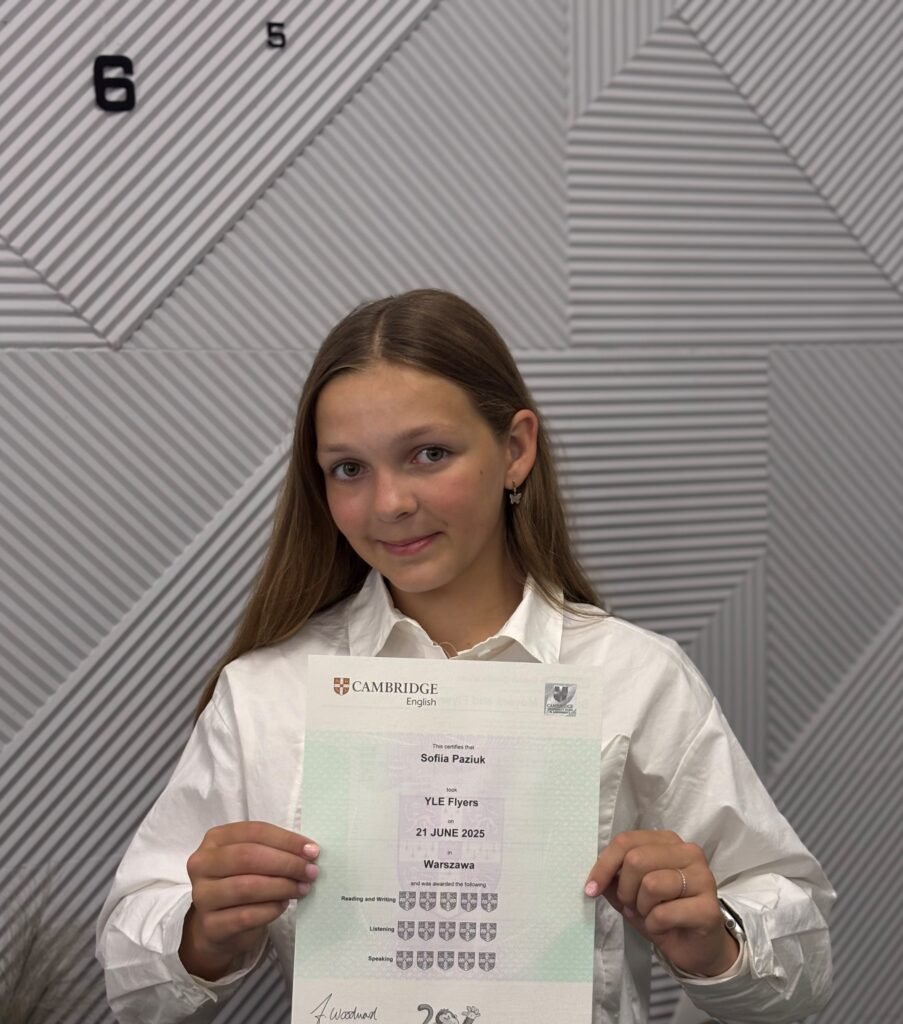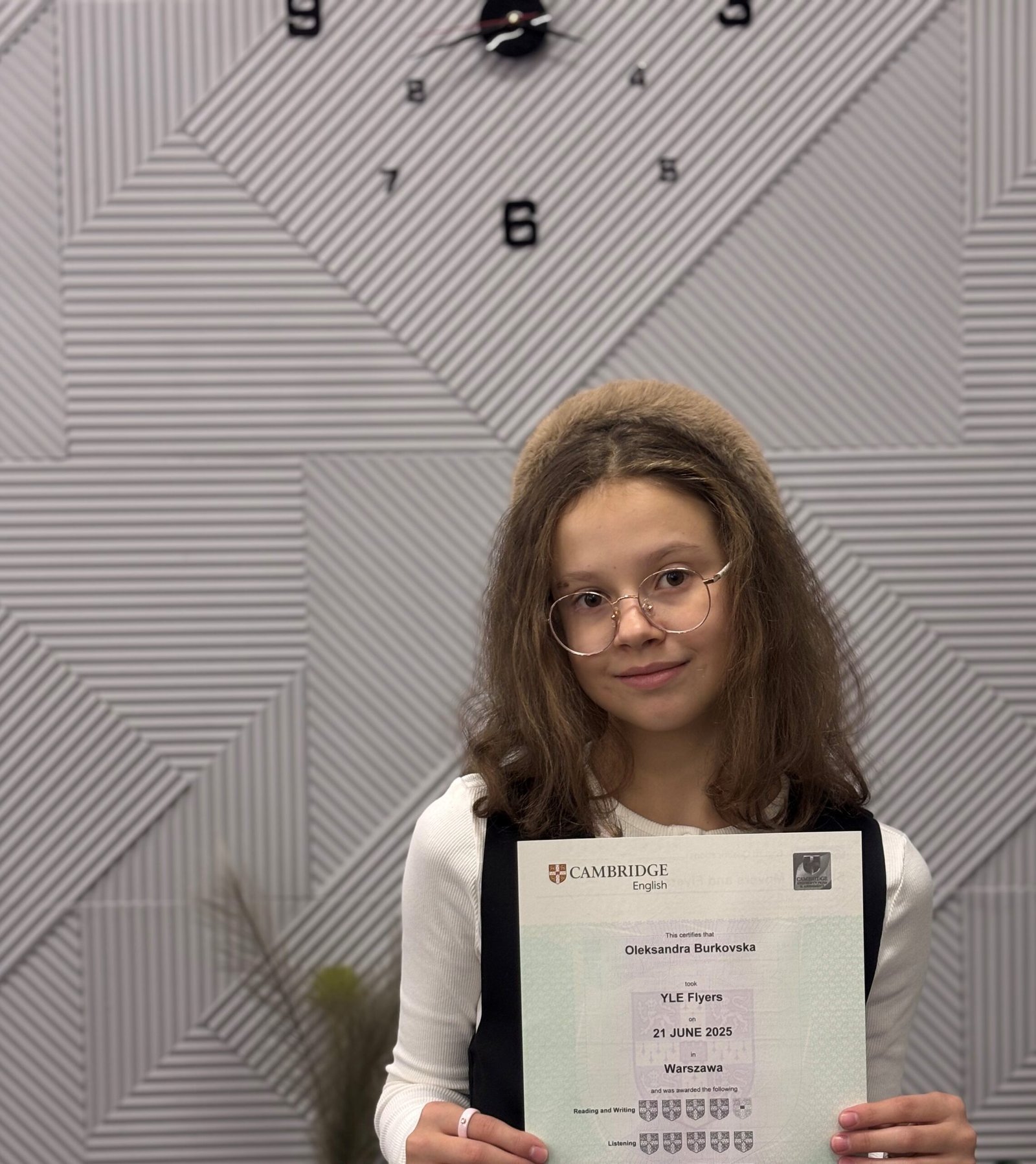 21 червня 2025 року у місті Варшава (Польща) наші четвертокласники та п’ятикласники — Дудченко Андрій, Побережна Катерина, Бурковська Олександра, Зарва Еліна, Туровець Віра та Пазюк Софія — успішно підтвердили рівень А2, склавши іспит A2 Flyers (для дітей віком до 12 років).