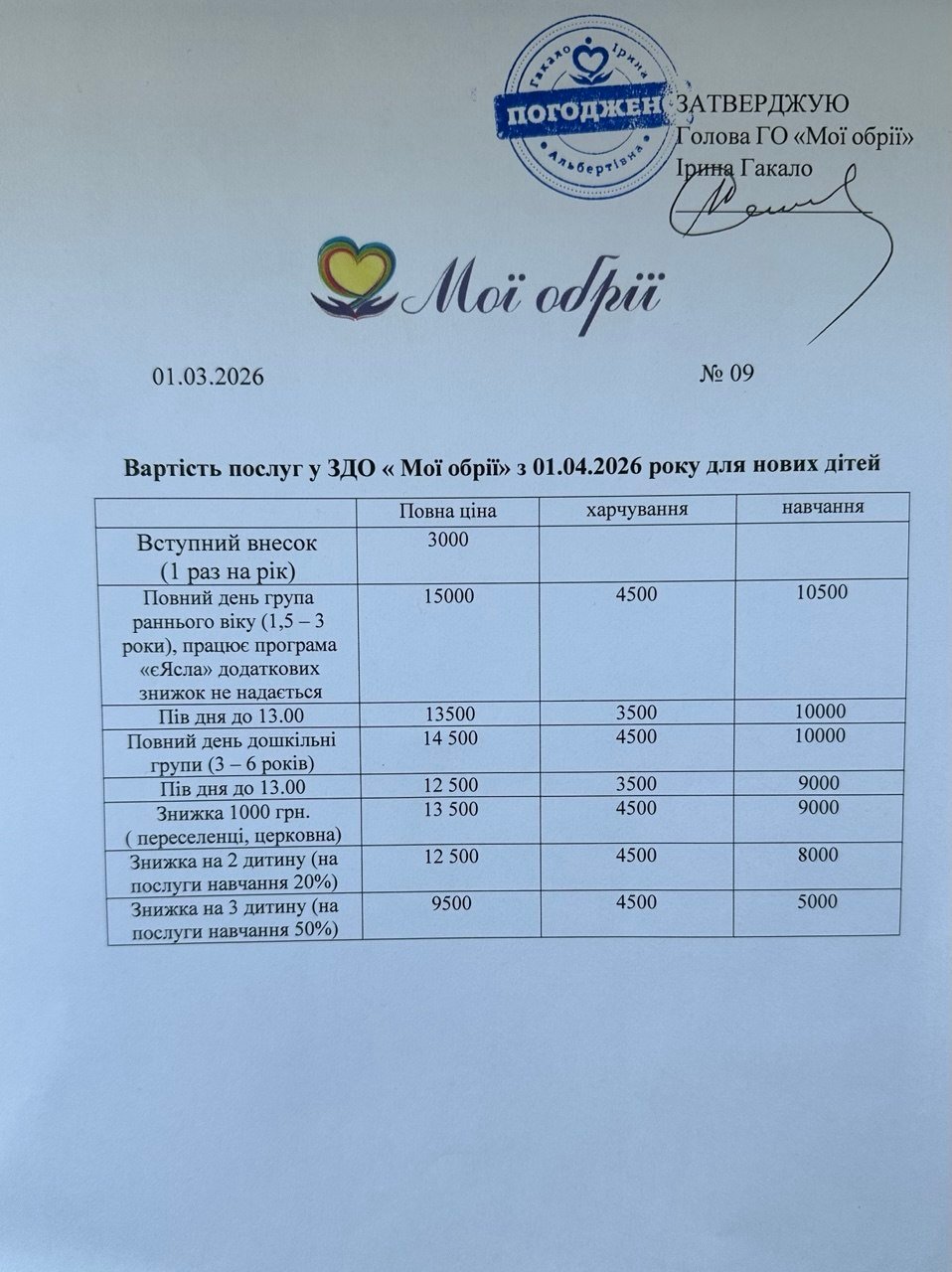 OpenCost of services in the "My Horizons" ZDO from 01.04.2026